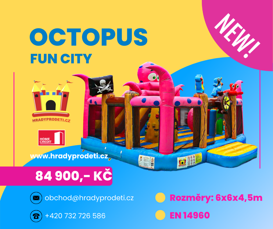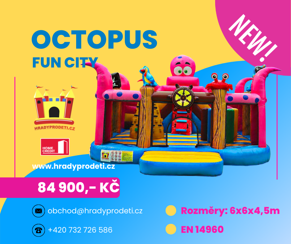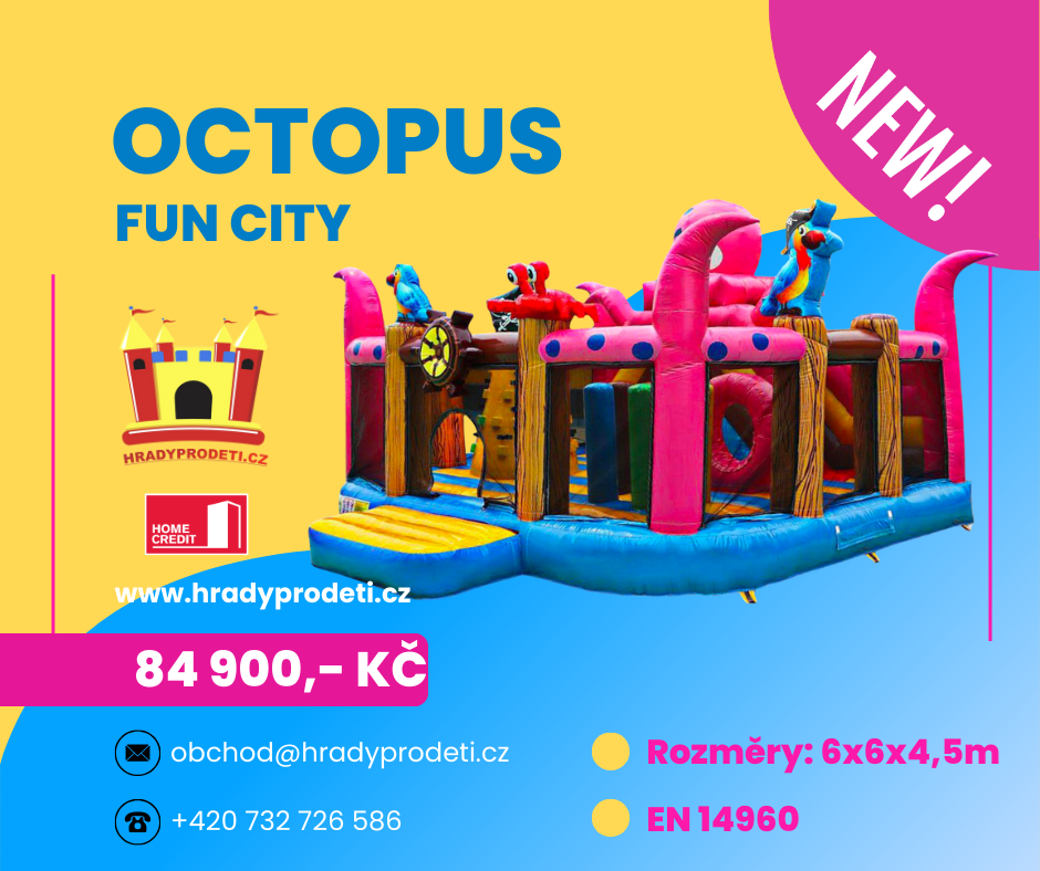 🐙 OCTOPUS FUN CITY – NOVINKA! 🌊🎉Obrovská nafukovací atrakce Octopus Fun City promění každou akci v zábavné mořské dobrodružství! Barevná chobotnice s veselým designem, prolézačky, překážky i skluzavky zaručí dětem hodiny radosti a pohybu.✅ Rozměry: 6 × 6 × 4,5 m – velký prostor plný zábavných prvků✅ Certifikace EN 14960 – maximální bezpečnost a profesionální kvalita✅ Originální mořský design, který děti okamžitě nadchne✅ Ideální na dětské dny, obecní slavnosti, školní i firemní akce👉 Octopus Fun City je multifunkční nafukovací atrakce, která se stane dominantou vaší akce a oblíbeným místem pro všechny děti.💰 Cena: 84 900 Kč s DPH💳 Možnost nákupu na splátky přes Home Credit