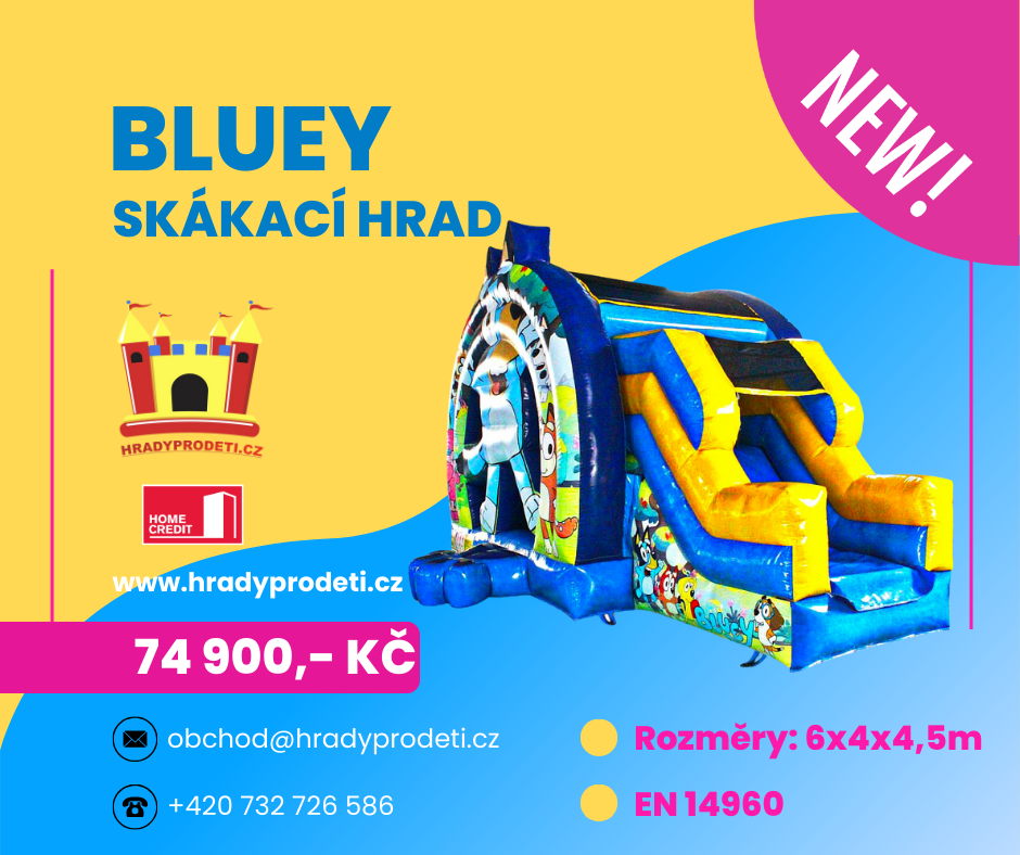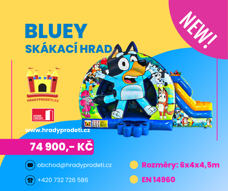💙 BLUEY SKÁKACÍ HRAD🐾✨Oblíbený pejsek Bluey dorazil i na nafukovací atrakce! Barevný a veselý skákací hrad s motivy ze stejnojmenného seriálu přinese dětem radost, pohyb a nekonečnou zábavu. Díky skluzavce a prostorné skákací ploše se stane magnetem každé akce.✅ Rozměry: 6 × 4 × 4,5 m – ideální velikost pro menší i větší akce✅ Certifikace EN 14960 – profesionální kvalita a maximální bezpečnost✅ Populární motiv Bluey – děti ho okamžitě poznají a zamilují si ho✅ Skvělá volba pro obecní slavnosti, školní akce, dětské oslavy i firemní eventy👉 Skákací hrad Bluey je garancí smíchu a radosti – děti si ho zamilují na první pohled!💰 Cena: 74 900 Kč s DPH💳 Možnost nákupu na splátky přes Home Credit