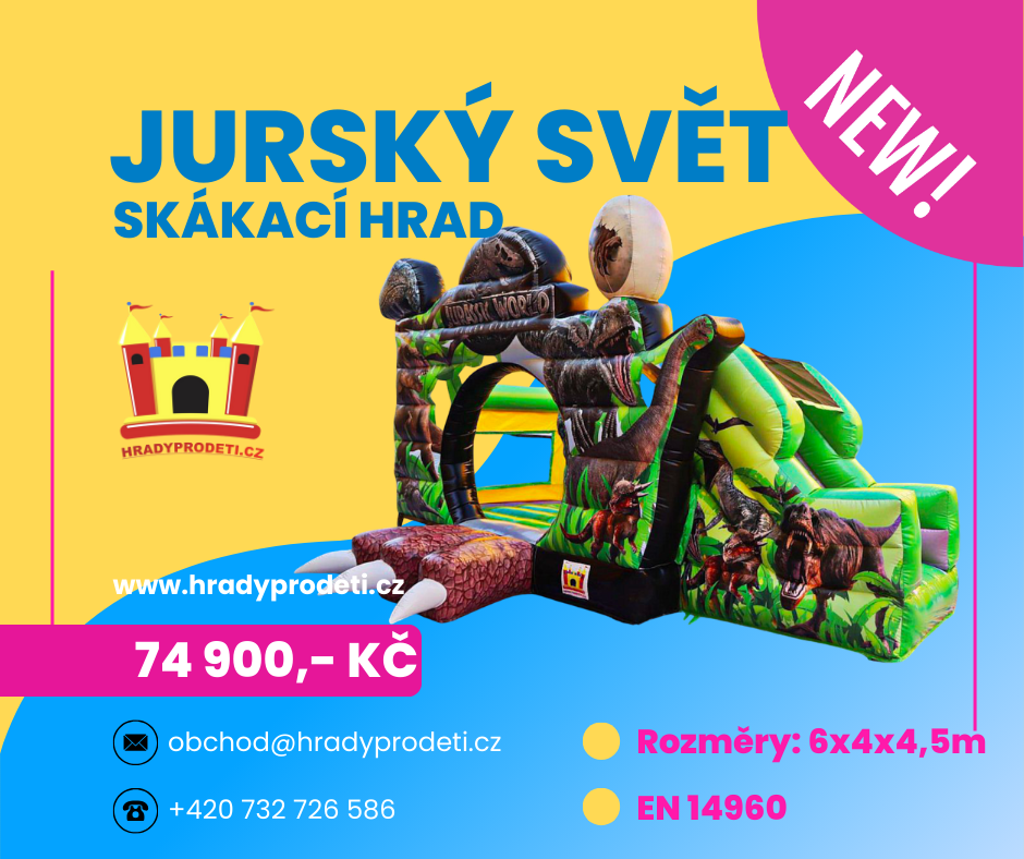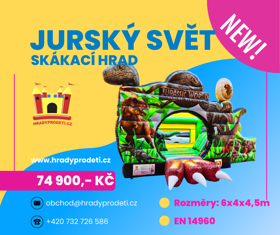🦖 JURSKÝ SVĚT SKÁKACÍ HRAD – NOVINKA! 🌟Vstupte do světa dinosaurů! Skákací hrad Jurský svět nabídne dětem neopakovatelné dobrodružství mezi pravěkými ještěry. Realistické motivy a skluzavka zajistí spoustu pohybu, smíchu a skvělé zábavy.✅ Rozměry: 6 × 4 × 4,5 m – ideální velikost na větší i menší akce✅ Certifikace EN 14960 – bezpečnost a profesionální kvalita✅ Atraktivní dinosauří design, který zaujme na první pohled✅ Skvělá volba pro obecní slavnosti, dětské dny, školní akce i firemní eventy👉 Jurský svět se stane hlavním magnetem vaší akce a děti si ho naprosto zamilují!💰 Cena: 74 900 Kč s DPH💳 Možnost nákupu na splátky přes Home Credit