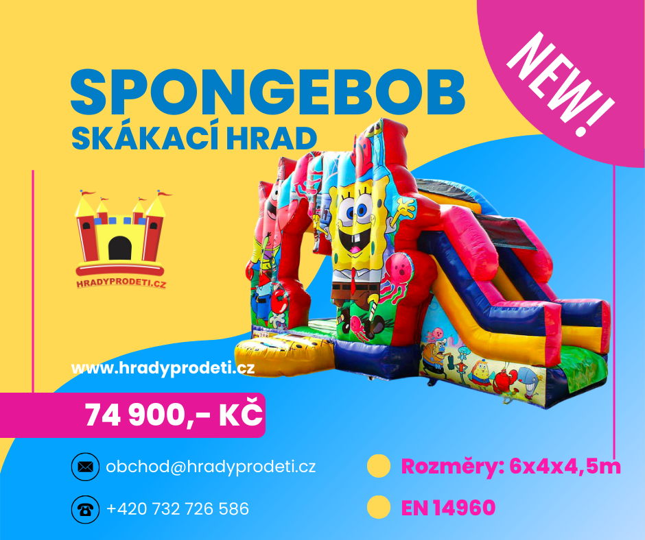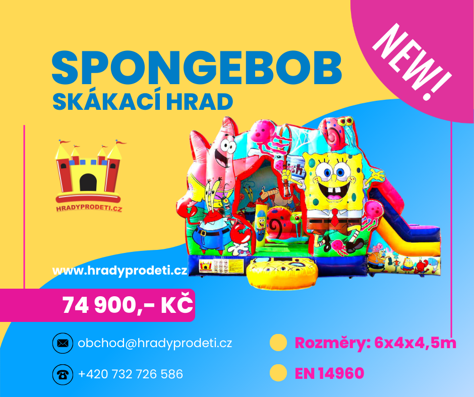 🌊 SPONGEBOB SKÁKACÍ HRAD – NOVINKA! 🧽⭐Oblíbený mořský hrdina SpongeBob dorazil i na nafukovací atrakce! Tento barevný a veselý skákací hrad s motivem SpongeBoba a jeho kamarádů přinese dětem spoustu smíchu, pohybu a nezapomenutelných zážitků.✅ Rozměry: 6 × 4 × 4,5 m – ideální kombinace skákání a skluzavky✅ Certifikace EN 14960 – bezpečnost a profesionální kvalita✅ Populární motiv, který děti okamžitě poznají a zamilují si✅ Vhodný pro obecní slavnosti, firemní eventy, školní akce i narozeninové oslavy👉 Tento skákací hrad se stane hlavní atrakcí vaší akce a zaručí zábavu na celé hodiny!💰 Cena: 74 900 Kč s DPH💳 Možnost nákupu na splátky přes Home Credit