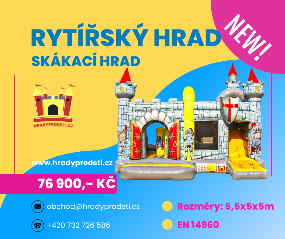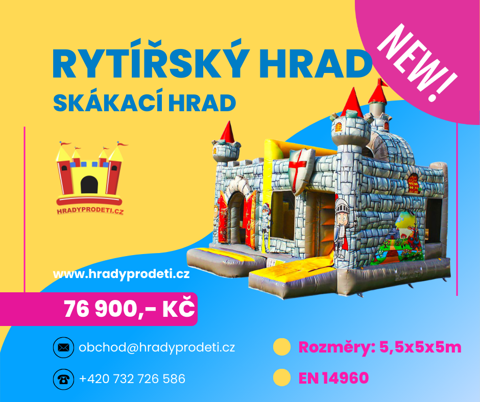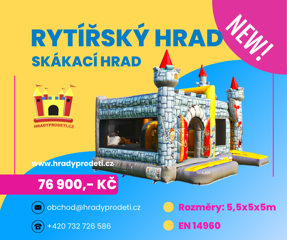 🛡️ RYTÍŘSKÝ SKÁKACÍ HRAD ⚔️🏰Vstupte do světa statečných rytířů a pohádkových dobrodružství! Nafukovací Rytířský hrad přinese dětem jedinečný zážitek plný fantazie, pohybu a zábavy. Díky atraktivnímu designu s věžemi, cimbuřím a rytířskými motivy se stane hlavním tahákem každé akce.✅ Rozměry: 5,5 × 5 × 5 m – prostorný hrad pro spoustu dovádění✅ Certifikace EN 14960 – záruka bezpečnosti a profesionální kvality✅ Realistické zpracování v rytířském stylu, které děti okamžitě zaujme✅ Ideální na obecní slavnosti, dětské dny, školní i firemní akce👉 Rytířský hrad se stane dominantou vaší akce a zajistí dětem nezapomenutelnou zábavu.💰 Cena: 76 900 Kč s DPH💳 Možnost nákupu na splátky přes Home Credit