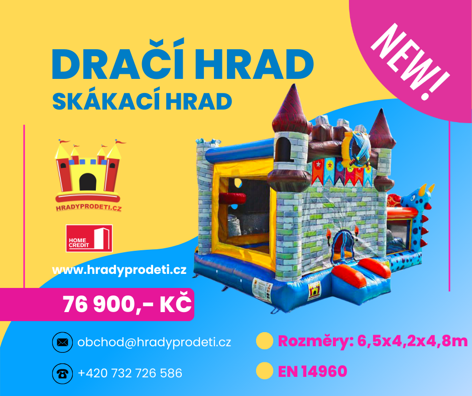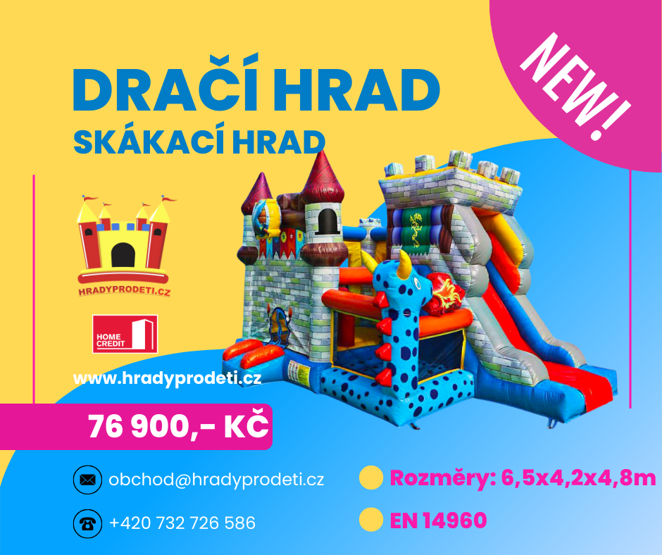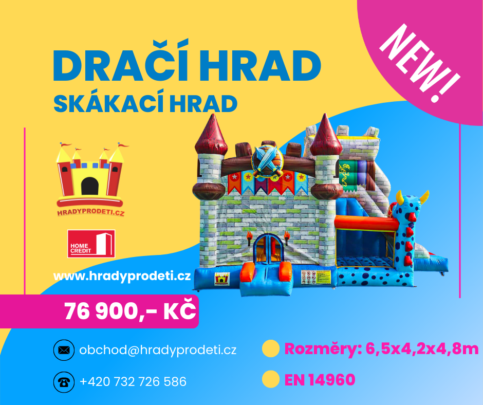 🐉 DRAČÍ SKÁKACÍ HRAD 🏰🔥Staňte se součástí dobrodružství plného rytířů, kouzel a draků! Barevný a detailně zpracovaný Dračí hrad se skluzavkou přenese děti do světa fantazie, kde na ně čeká spousta pohybu, smíchu a nezapomenutelných zážitků.✅ Rozměry: 6,5 × 4,2 × 4,8 m – prostorný hrad pro spoustu dovádění✅ Certifikace EN 14960 – profesionální kvalita a maximální bezpečnost✅ Originální design s věžemi a draky, který děti okamžitě nadchne✅ Vhodný na dětské dny, obecní slavnosti, školní i firemní akce👉 Dračí hrad se stane dominantou každé akce a děti si ho zamilují od první chvíle.💰 Cena: 76 900 Kč s DPH💳 Možnost nákupu na splátky přes Home Credit
