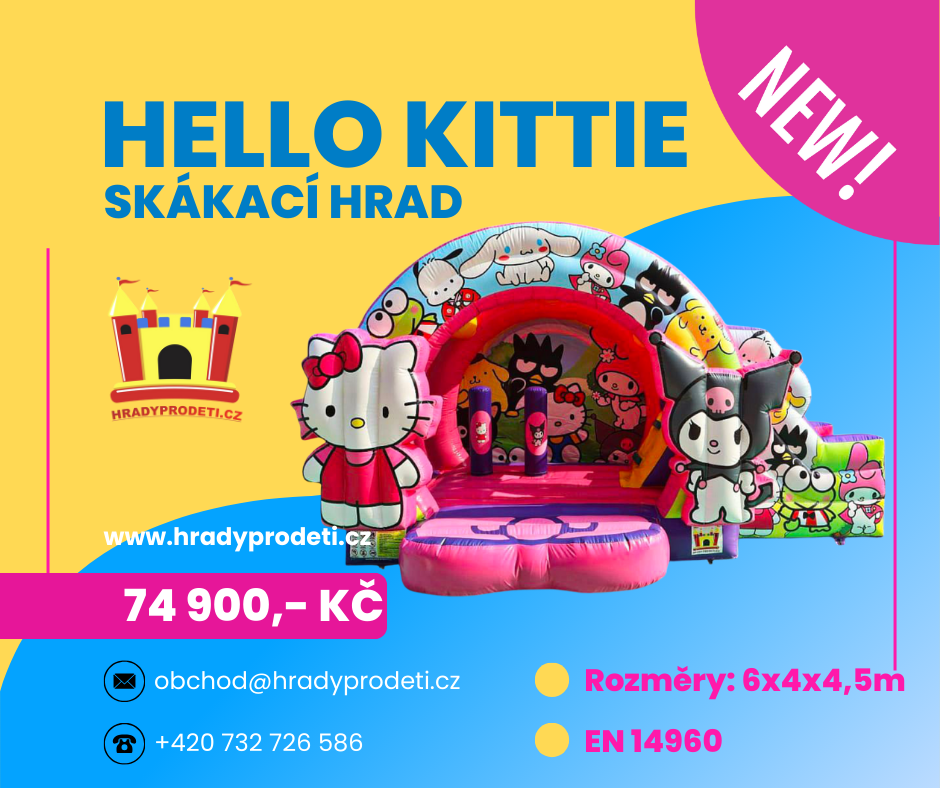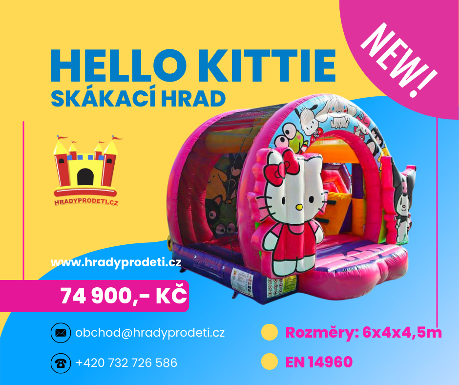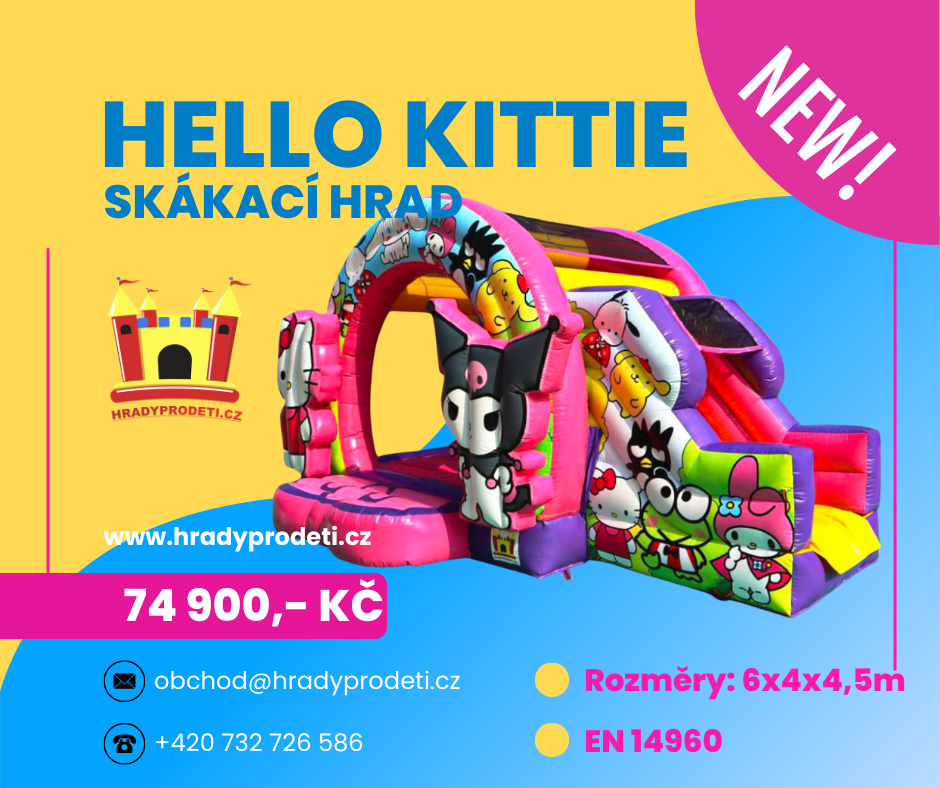 🎀 HELLO KITTY SKÁKACÍ HRAD 🌟Barevný a veselý skákací hrad s motivem Hello Kitty a jejích přátel přinese kouzelnou atmosféru na každou akci! Děti si ho okamžitě zamilují a užijí si nekonečné hodiny skákání, dovádění a radosti.✅ Rozměry: 6 × 4 × 4,5 m – ideální pro menší i větší akce✅ Certifikace EN 14960 – maximální bezpečnost a profesionální provedení✅ Populární motiv, který milují děti po celém světě✅ Vhodný na dětské dny, narozeninové oslavy, školní akce i firemní eventy👉 Hello Kitty hrad se stane hlavní atrakcí vaší akce a zaručeně potěší malé i velké návštěvníky!💰 Cena: 74 900 Kč s DPH💳 Možnost nákupu na splátky přes Home Credit